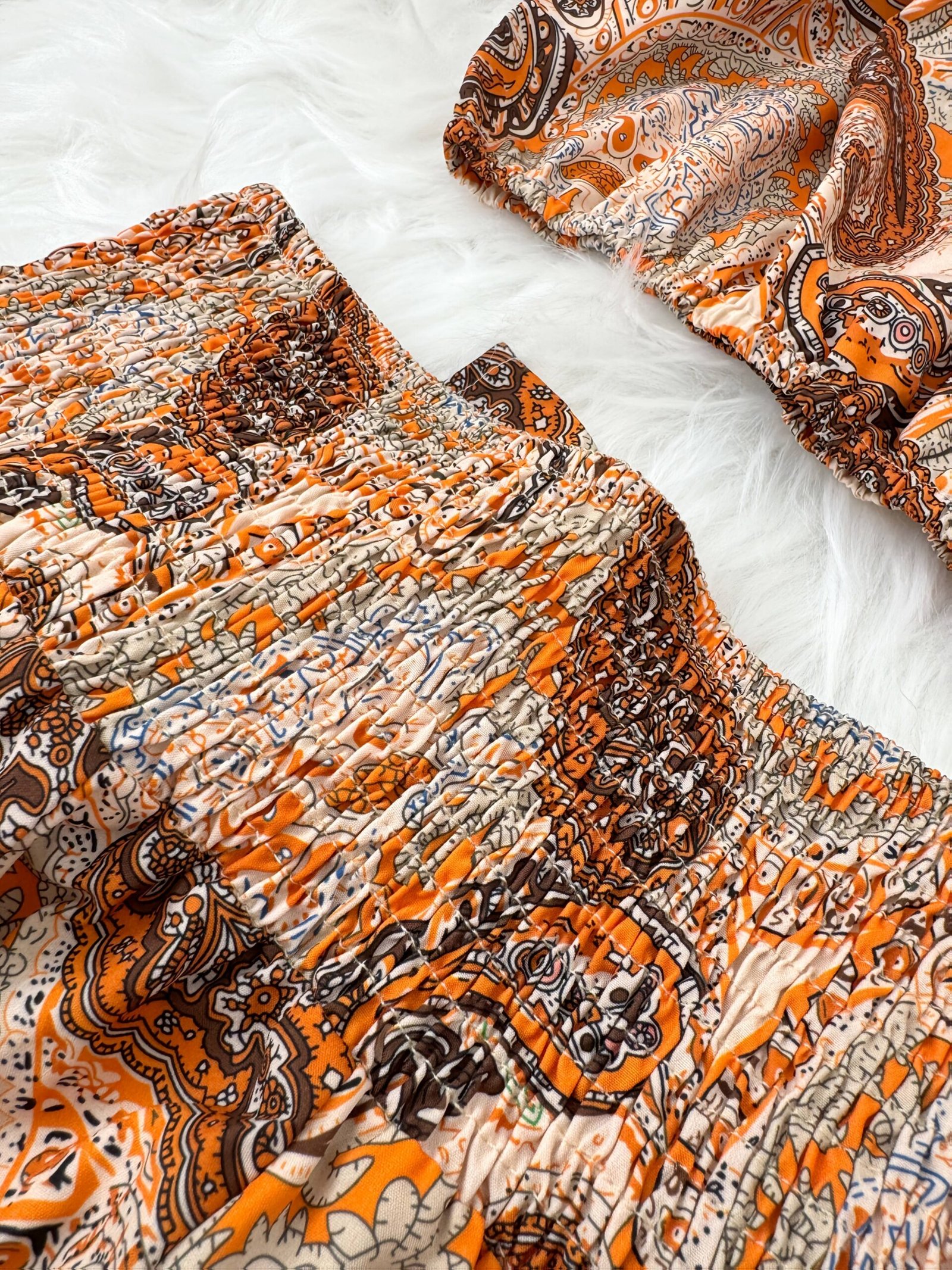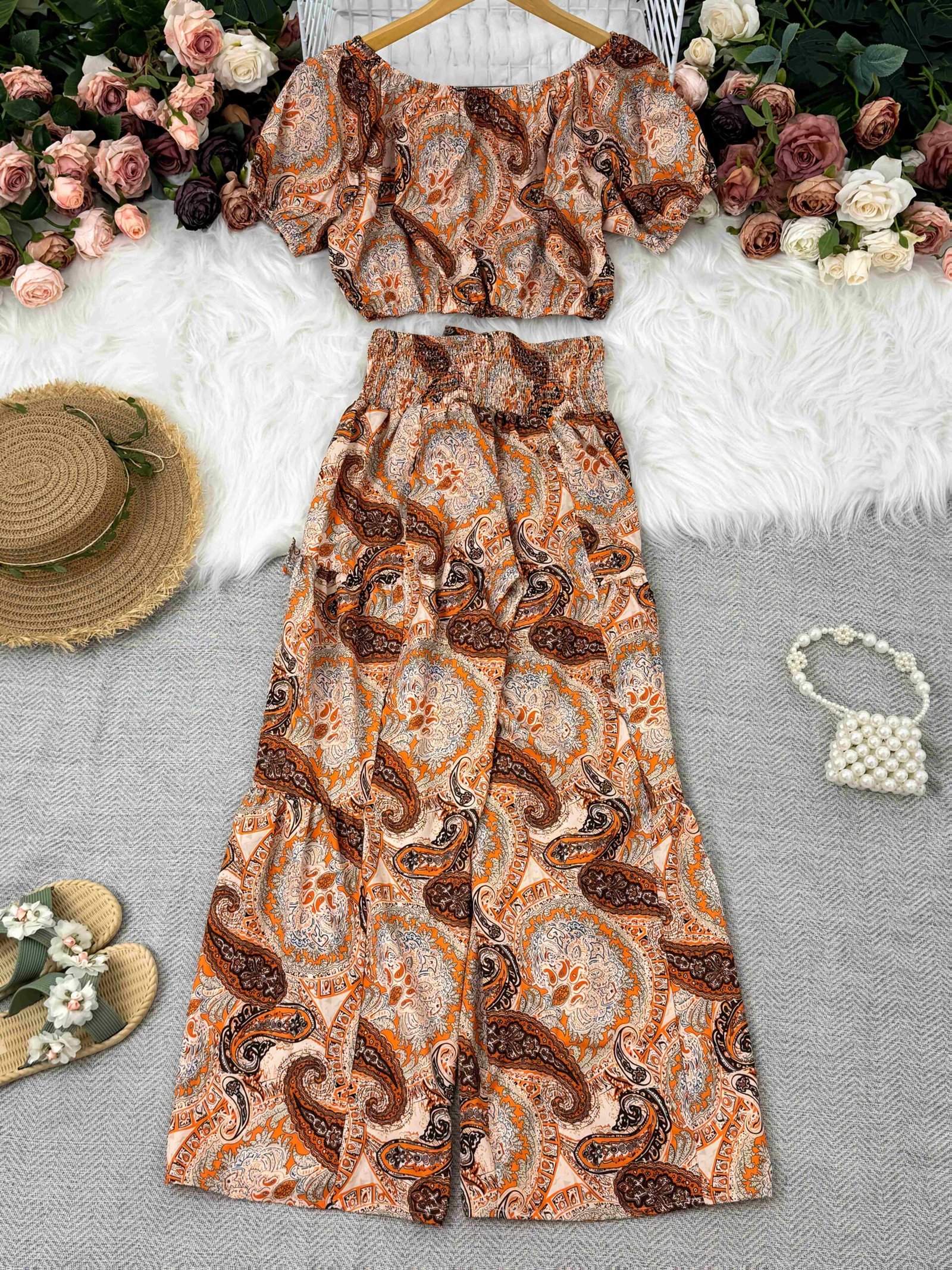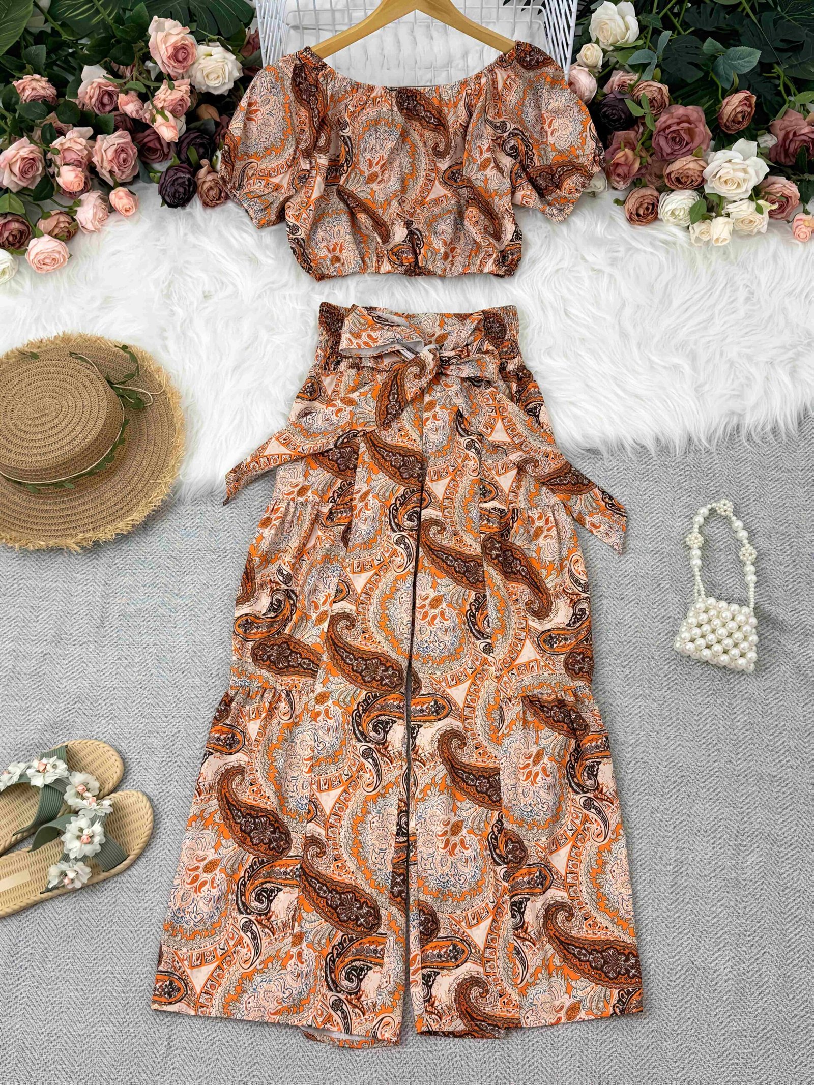 Un ensemble d’été style vacances à la plage avec manches bouffantes