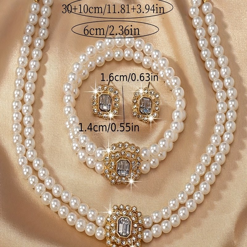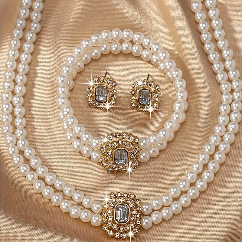 Un ensemble élégant d’inspiration française comprenant des boucles d’oreilles carrées géométriques à double rangée de fausses perles, un bracelet et un collier, parfait comme cadeau pour les amies et adapté au port quotidien par les femmes.
