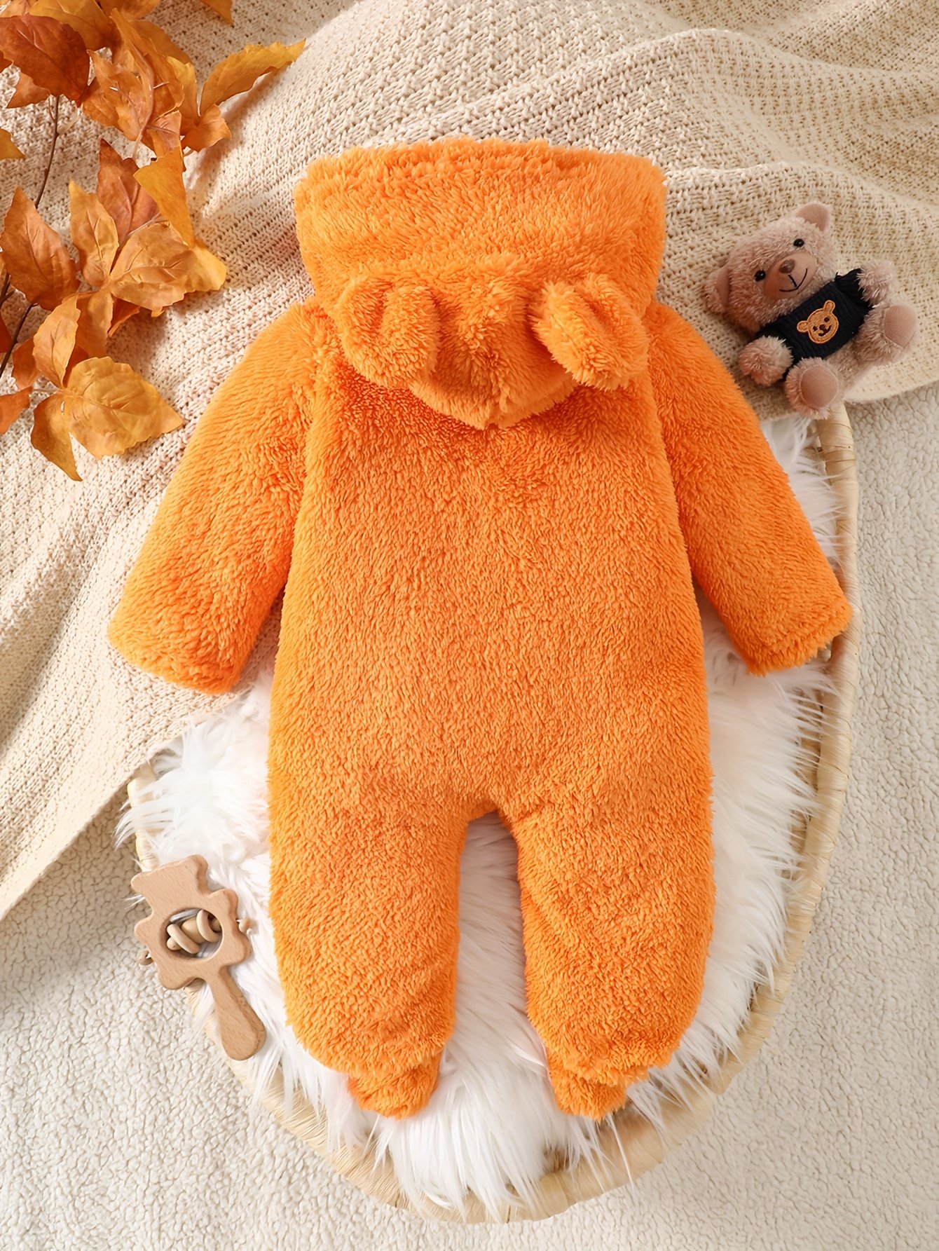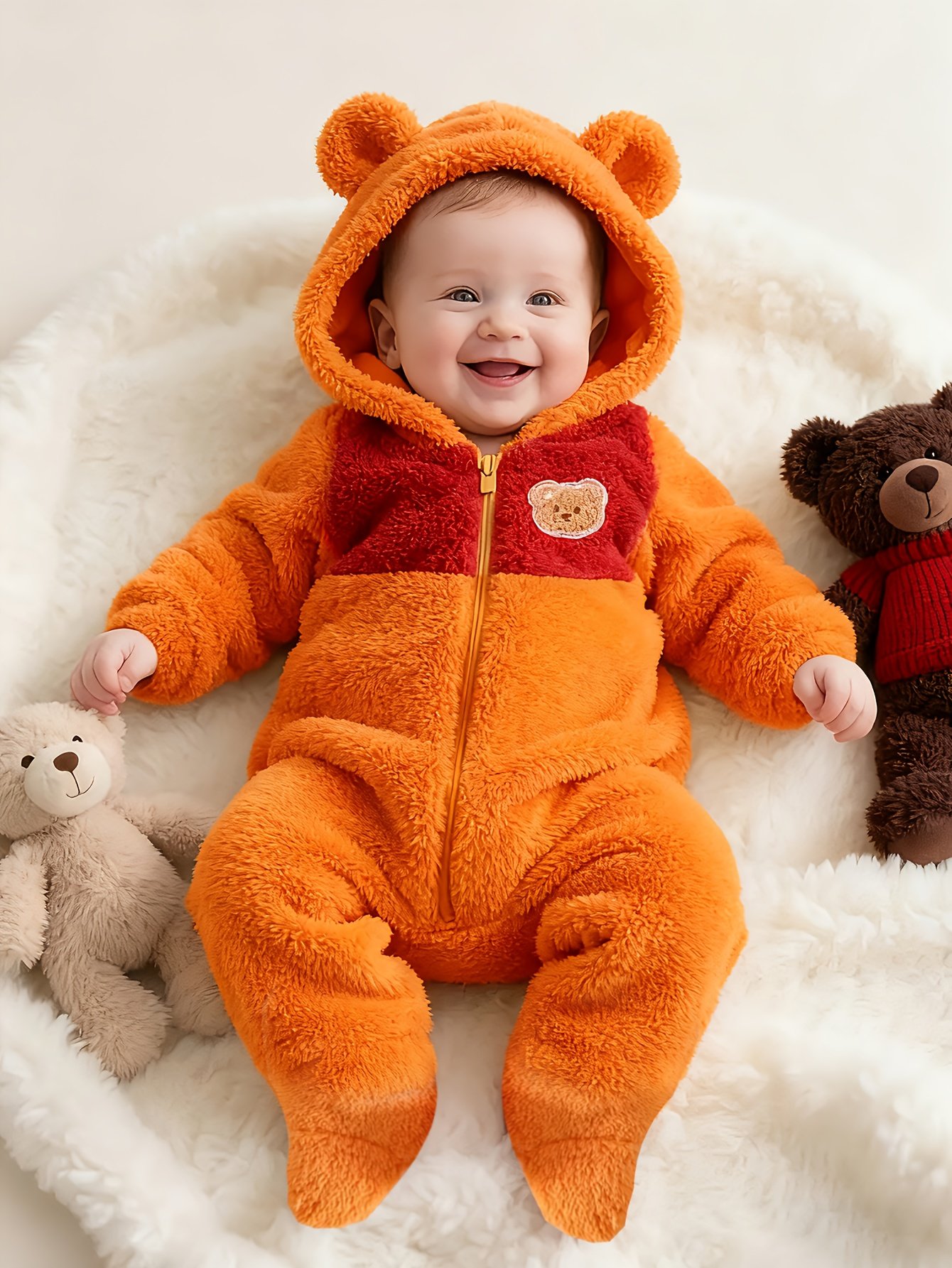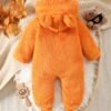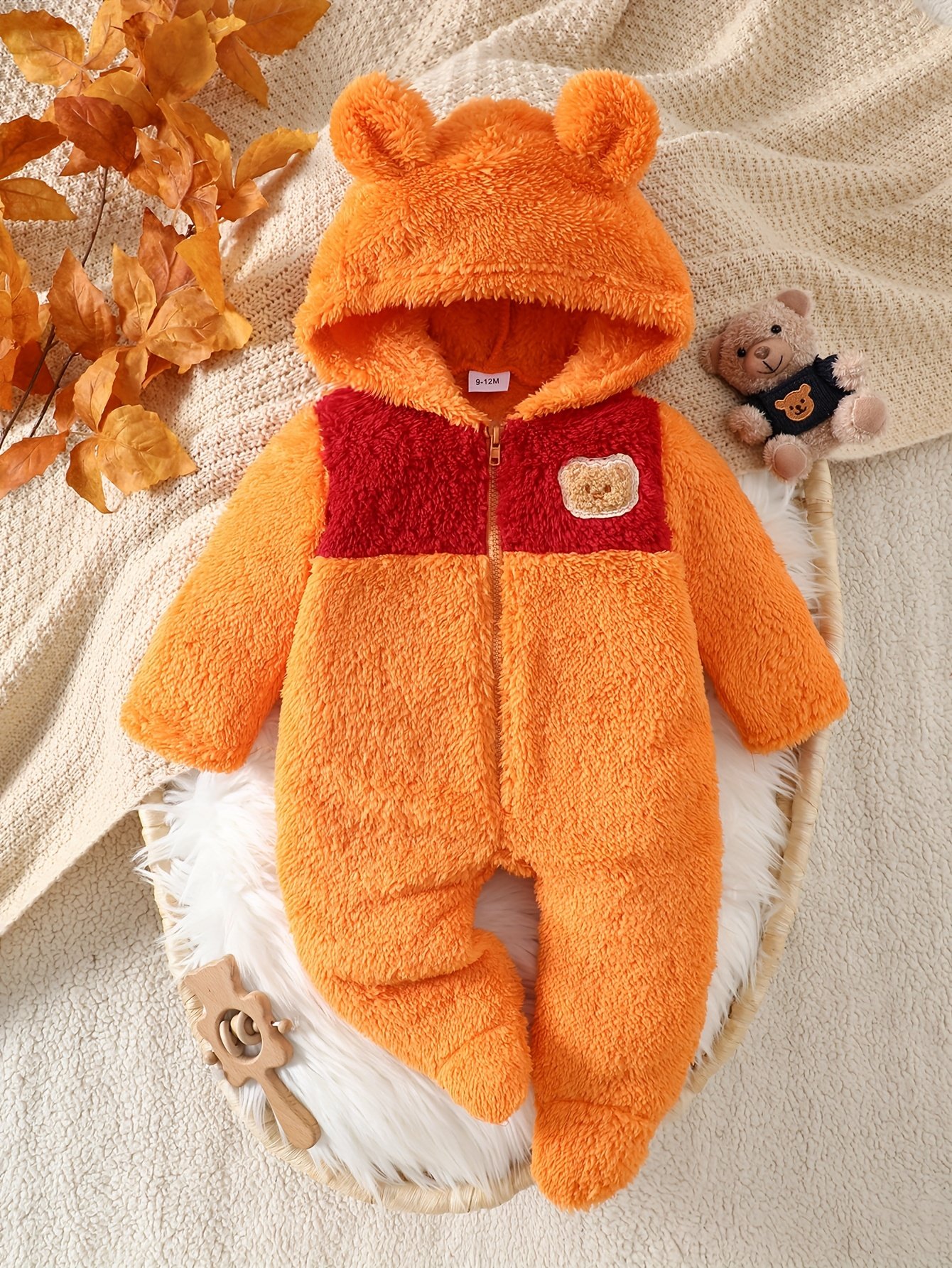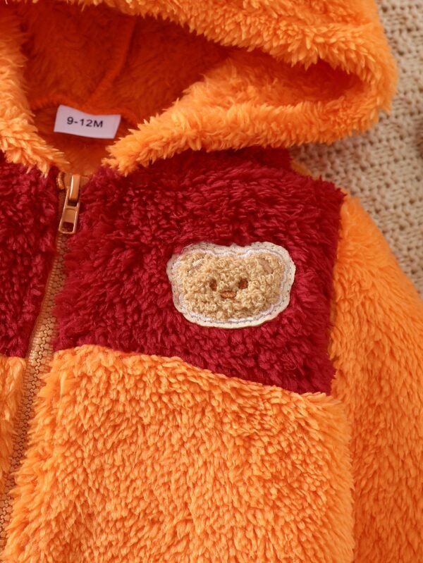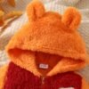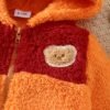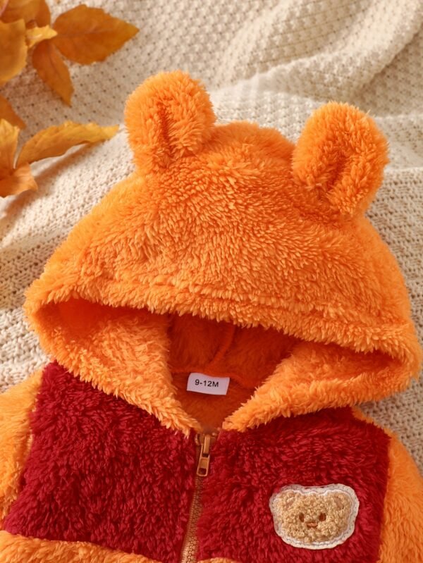 Une tenue de bébé nouveau-né pour l’automne et l’hiver avec un design color-block, un capuche et des pieds, ornée d’une jolie patch ours. C’est un choix élégant pour les nourrissons et un cadeau adorable pour les bébés, idéal pour l’extérieur.