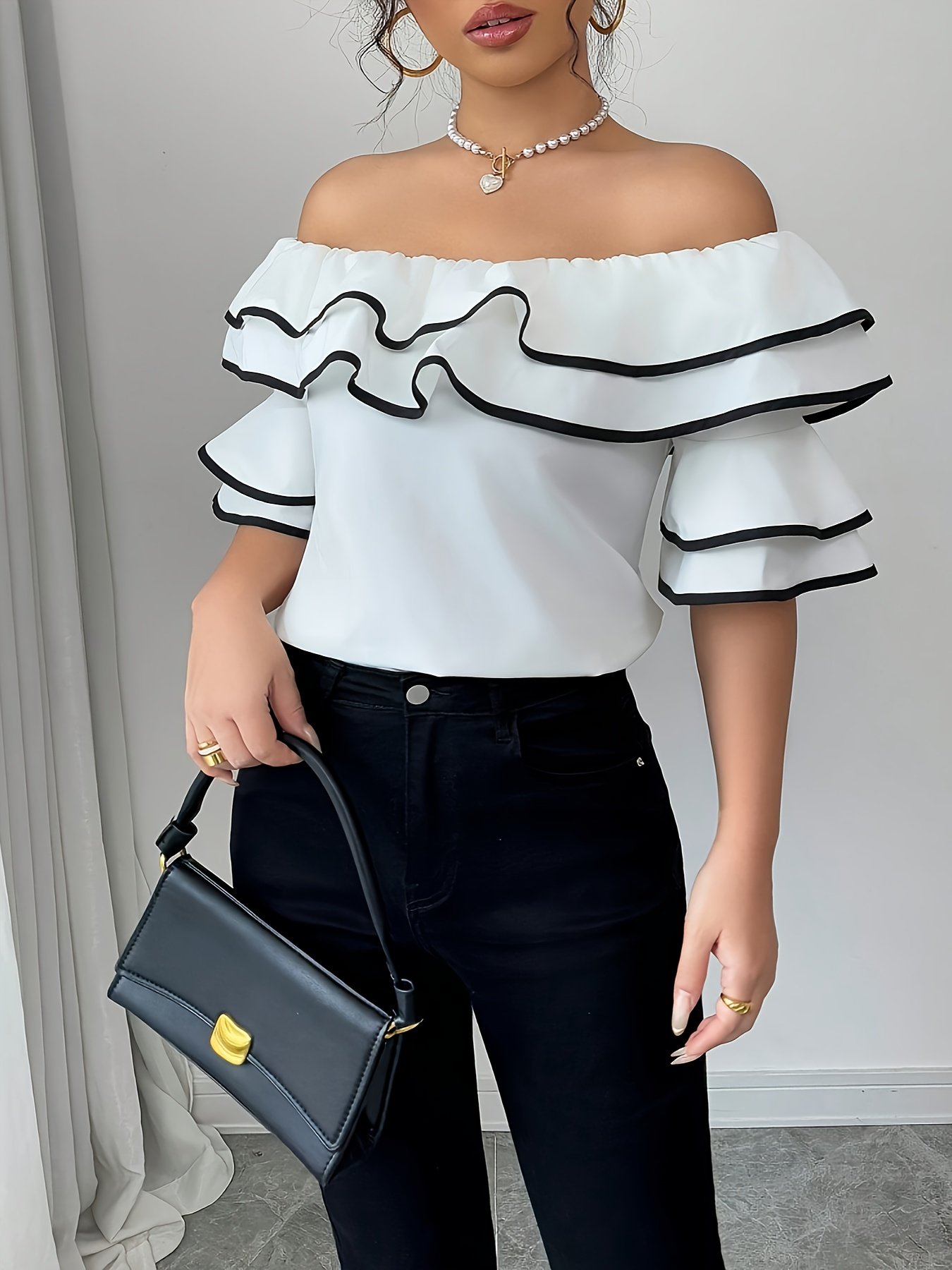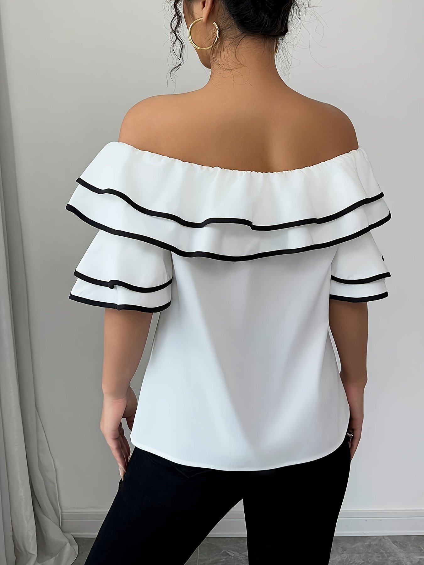 YY0227215 Chemise Femme à Épaules Dénudées, Manches Courtes et Volants, Uni