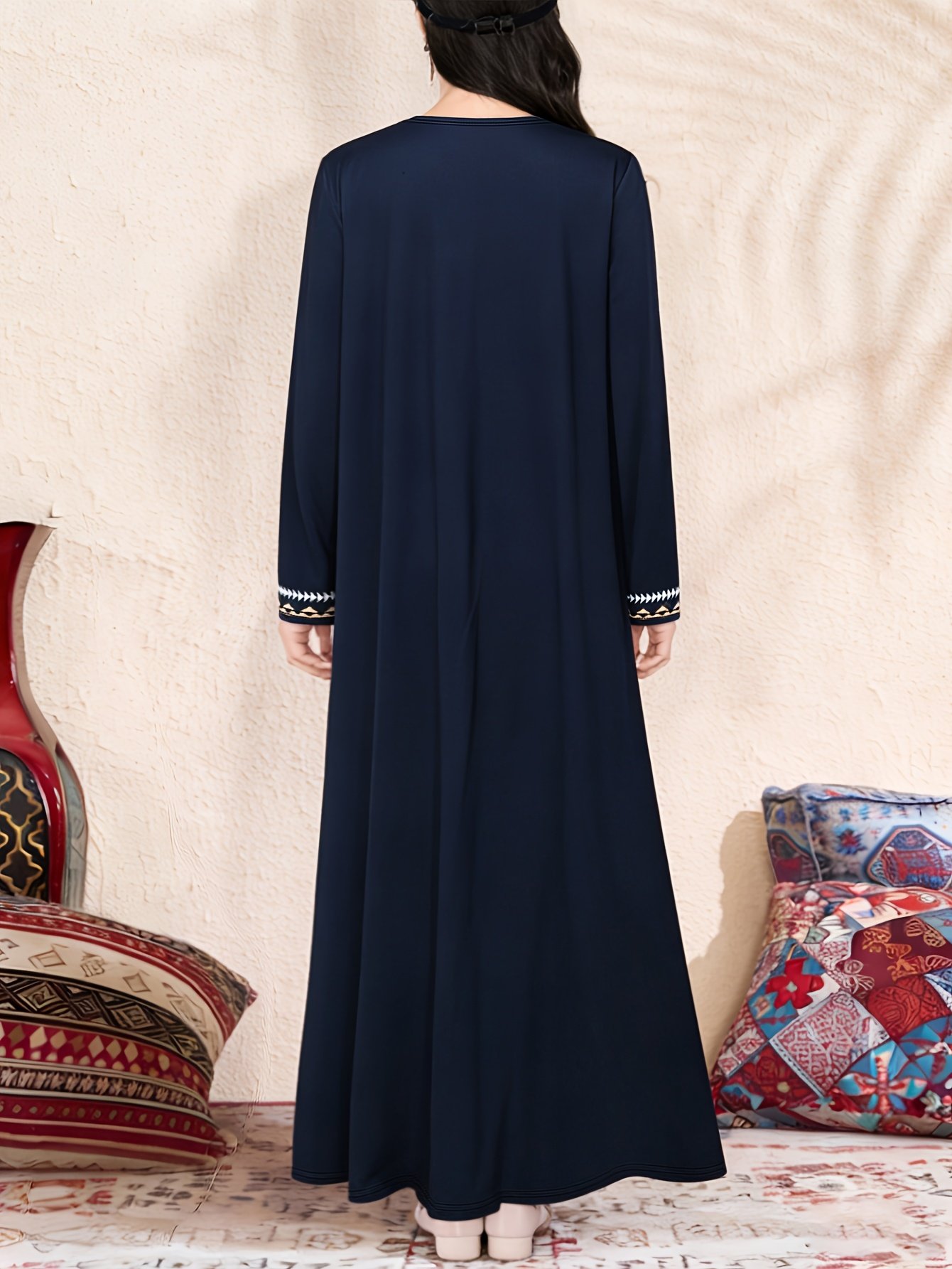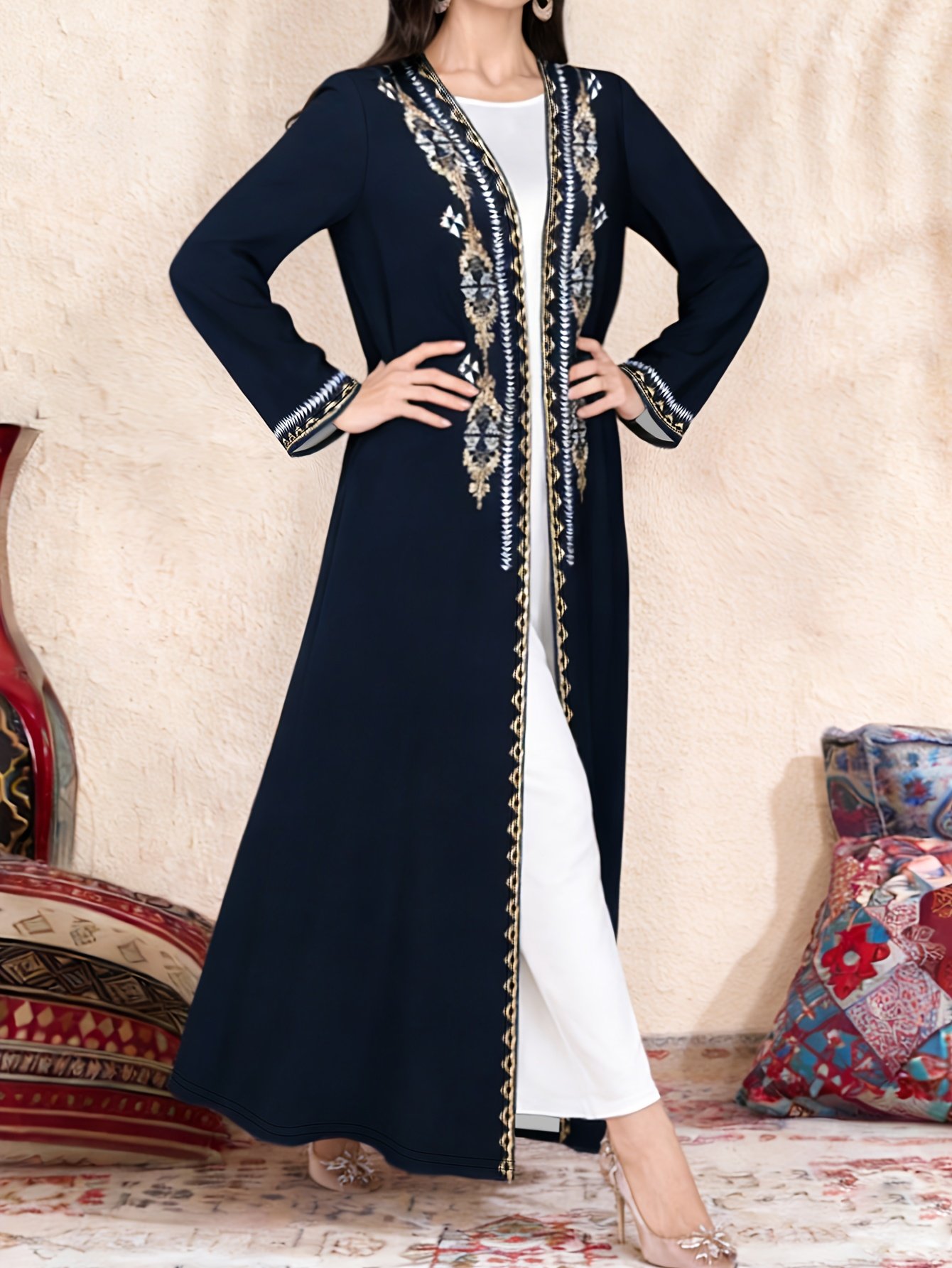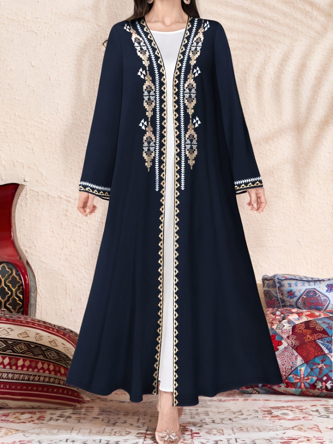 ZD251209008 Cardigan Robe Élégant Style Moyen-Orient pour Femmes, Imprimé Ethnique Polyvalent à Manches Mi-Longues, Idéal pour Occasions Festives et Sorties, Direction Moyen-Orient